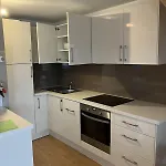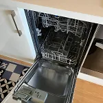 Cozinha equipada totalmente equipada está equipada com forno e máquina de lavar loiça.